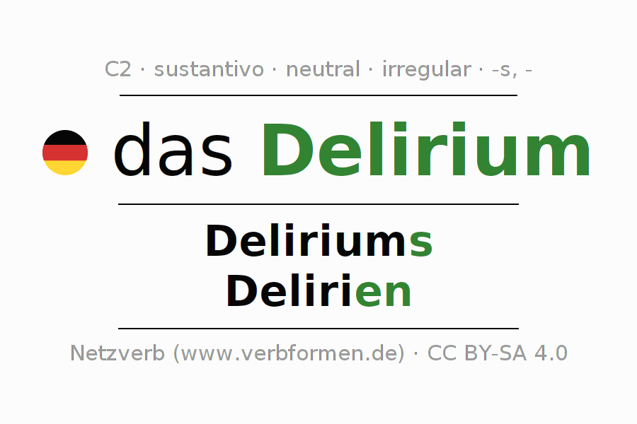 La declinación del sustantivoDelirium (delirio) se encuentra en genitivoDeliriums del singular y en el nominativoDelirien del plural. El sustantivo Delirium se declina con las terminaciones s/en. El género gramatical de Delirium es neutro y por eso se requiere el artículo definido ‘das’. Aquí puedes declinar no solamente Delirium sino también todos los sustantivos alemanes . Este sustantivo pertenece al vocabulario necesario para pasar el examen "Zertifikat Deutsch" o para el nivel C2. Comentarios ☆