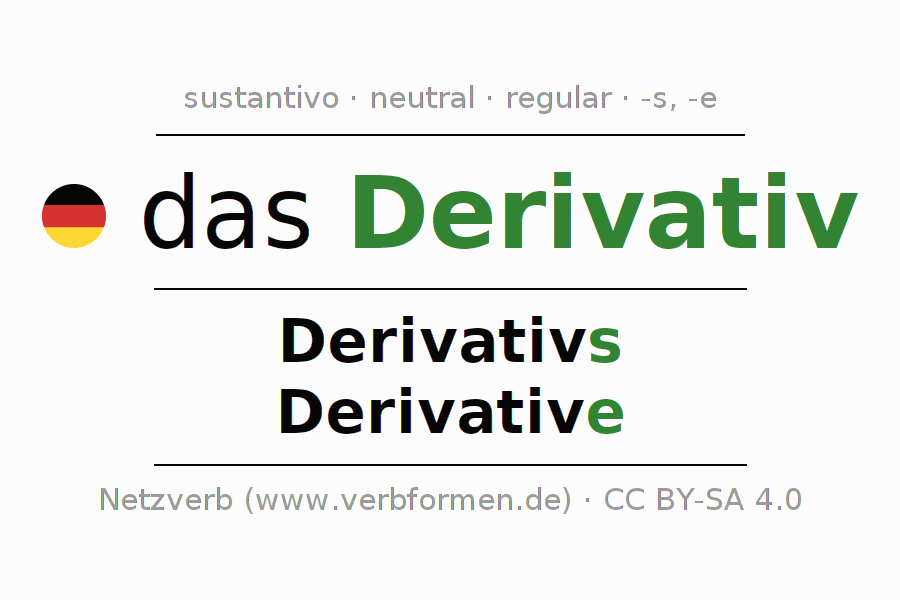 La declinación del sustantivoDerivativ (derivado, morfema derivativo) se encuentra en genitivoDerivativs del singular y en el nominativoDerivative del plural. El sustantivo Derivativ se conjuga de forma fuerte (irregular) con estas terminaciones s/e. El género gramatical de Derivativ es neutro y por eso se requiere el artículo definido ‘das’. Aquí puedes declinar no solamente Derivativ sino también todos los sustantivos alemanes . Comentarios ☆