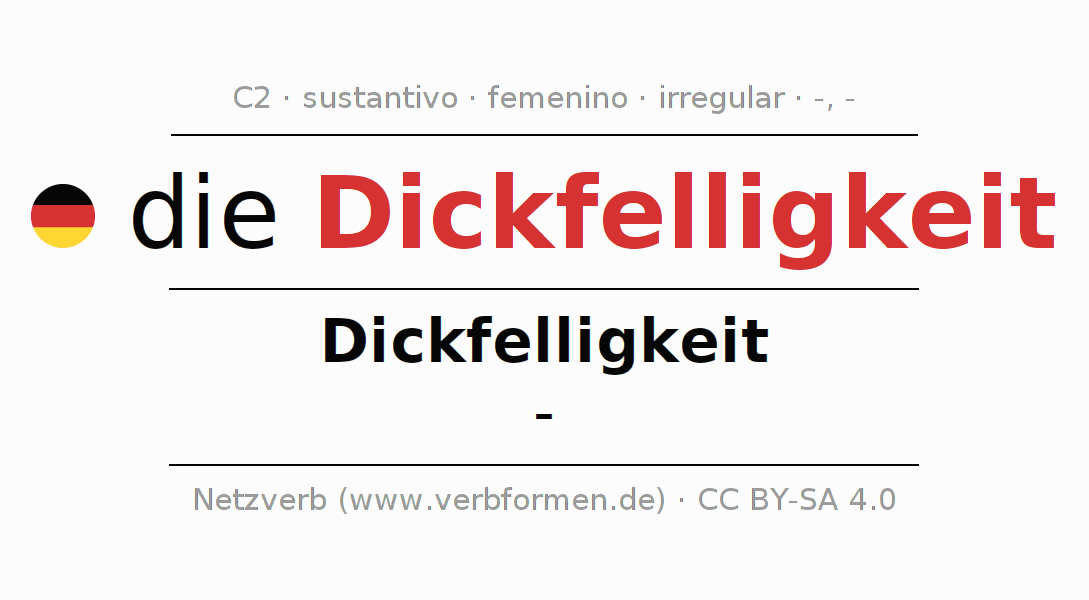 La declinación del sustantivo en forma de tabla con todas su formas: singular, plural y en los cuatro casos: nominativo (primer caso), genitivo (segundo caso), dativo (tercer caso) y acusativo (cuarto caso). Las construcciones gramaticales están representadas de forma clara en una tabla sinópica. La inflexión de los sustantivos es una ayuda durante tareas, exámenes, para cursos de alemán, la universidad, el estudio del alemán como lengua extranjera o como segundo idioma y para estudiantes adultos. La declinación correcta de las palabras es especialmente importante para los que aprenden el idioma alemán. Aquí encontraras más información acerca del tema Wiktionary Dickfelligkeit y aquí también a través del Duden Dickfelligkeit.
