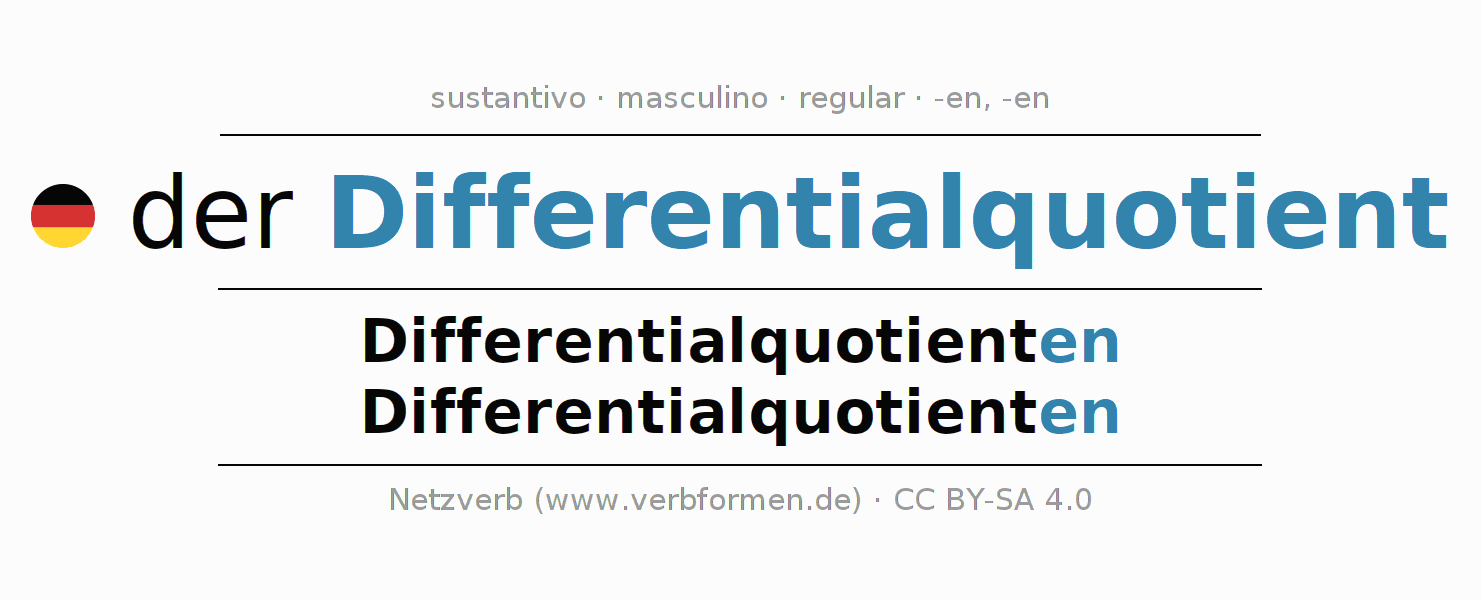 La declinación del sustantivo en forma de tabla con todas su formas: singular, plural y en los cuatro casos: nominativo (primer caso), genitivo (segundo caso), dativo (tercer caso) y acusativo (cuarto caso). Las construcciones gramaticales están representadas de forma clara en una tabla sinópica. La inflexión de los sustantivos es una ayuda durante tareas, exámenes, para cursos de alemán, la universidad, el estudio del alemán como lengua extranjera o como segundo idioma y para estudiantes adultos. La declinación correcta de las palabras es especialmente importante para los que aprenden el idioma alemán. Aquí encontraras más información acerca del tema Wiktionary Differentialquotient y aquí también a través del Duden Differentialquotient.