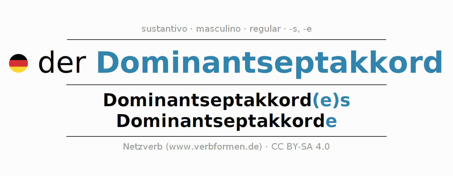 La declinación del sustantivo en forma de tabla con todas su formas: singular, plural y en los cuatro casos: nominativo (primer caso), genitivo (segundo caso), dativo (tercer caso) y acusativo (cuarto caso). Las construcciones gramaticales están representadas de forma clara en una tabla sinópica. La inflexión de los sustantivos es una ayuda durante tareas, exámenes, para cursos de alemán, la universidad, el estudio del alemán como lengua extranjera o como segundo idioma y para estudiantes adultos. La declinación correcta de las palabras es especialmente importante para los que aprenden el idioma alemán. Aquí encontraras más información acerca del tema Wiktionary Dominantseptakkord y aquí también a través del Duden Dominantseptakkord.