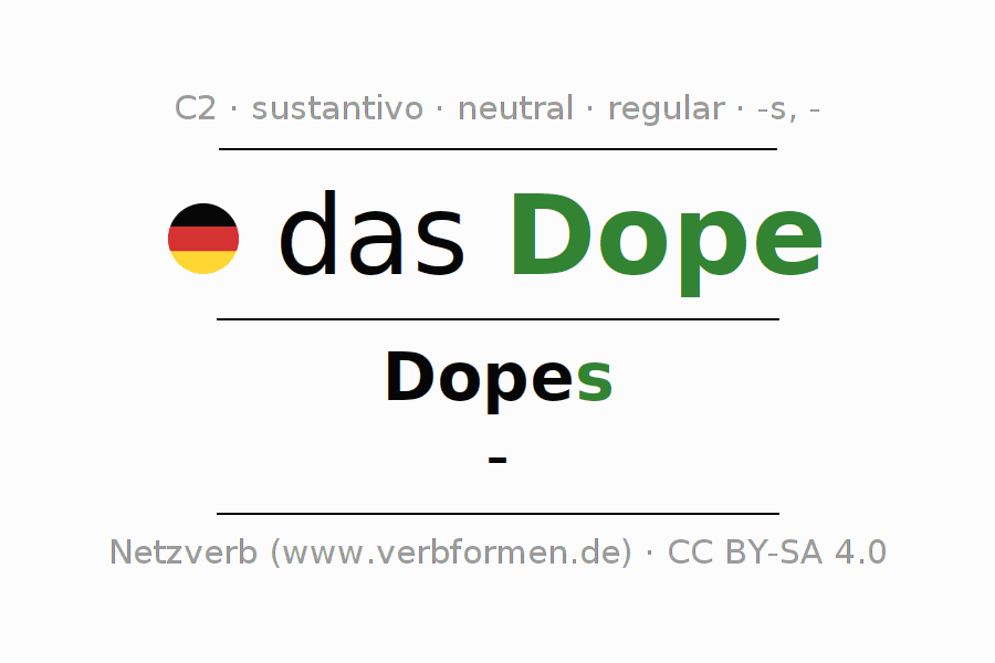 La declinación del sustantivoDope (droga, chocolate) se encuentra en genitivoDopes del singular y en el nominativo- del plural. El sustantivo Dope se conjuga de forma fuerte (irregular) con estas terminaciones s/-. No permite construcciones en plural. El género gramatical de Dope es neutro y por eso se requiere el artículo definido ‘das’. Aquí puedes declinar no solamente Dope sino también todos los sustantivos alemanes . Este sustantivo pertenece al vocabulario necesario para pasar el examen "Zertifikat Deutsch" o para el nivel C2. Comentarios ☆
