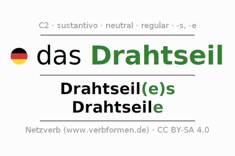 La declinación del sustantivo en forma de tabla con todas su formas: singular, plural y en los cuatro casos: nominativo (primer caso), genitivo (segundo caso), dativo (tercer caso) y acusativo (cuarto caso). Las construcciones gramaticales están representadas de forma clara en una tabla sinópica. La inflexión de los sustantivos es una ayuda durante tareas, exámenes, para cursos de alemán, la universidad, el estudio del alemán como lengua extranjera o como segundo idioma y para estudiantes adultos. La declinación correcta de las palabras es especialmente importante para los que aprenden el idioma alemán. Aquí encontraras más información acerca del tema Wiktionary Drahtseil y aquí también a través del Duden Drahtseil.