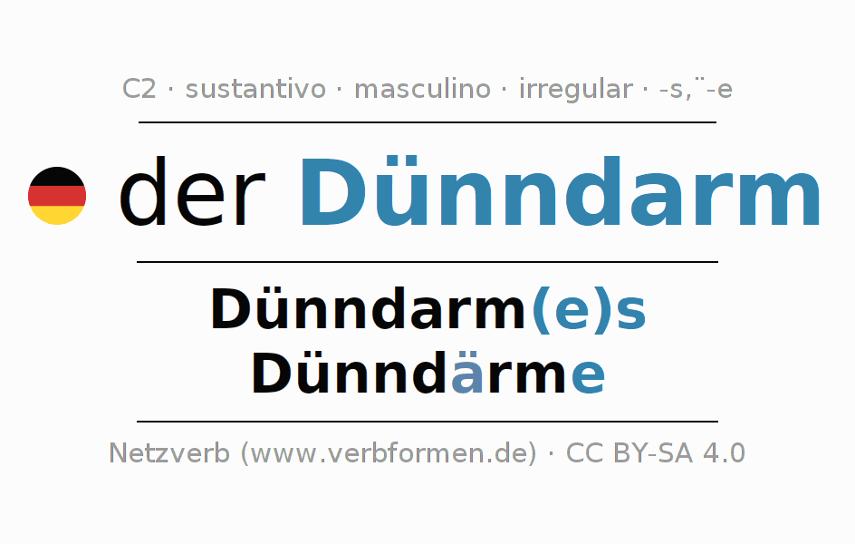 La declinación del sustantivo en forma de tabla con todas su formas: singular, plural y en los cuatro casos: nominativo (primer caso), genitivo (segundo caso), dativo (tercer caso) y acusativo (cuarto caso). Las construcciones gramaticales están representadas de forma clara en una tabla sinópica. La inflexión de los sustantivos es una ayuda durante tareas, exámenes, para cursos de alemán, la universidad, el estudio del alemán como lengua extranjera o como segundo idioma y para estudiantes adultos. La declinación correcta de las palabras es especialmente importante para los que aprenden el idioma alemán. Aquí encontraras más información acerca del tema Wiktionary Dünndarm y aquí también a través del Duden Dünndarm.