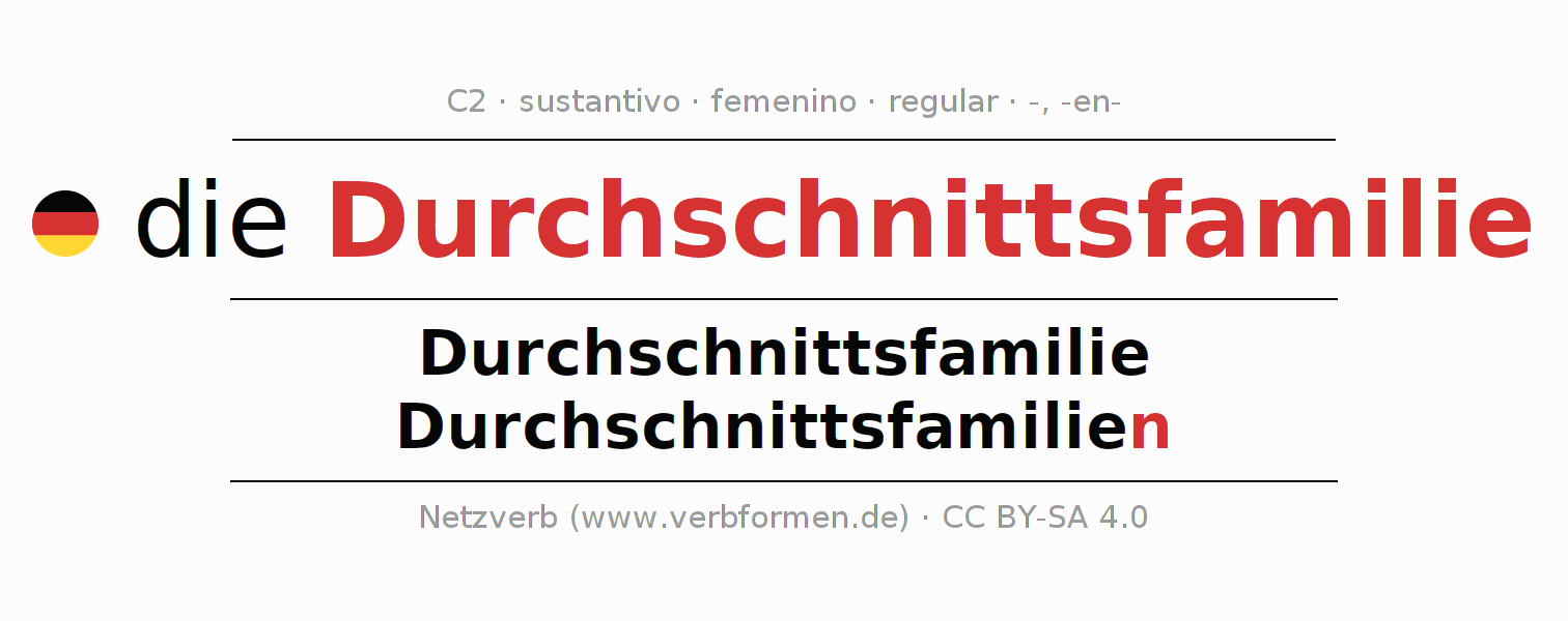 La declinación del sustantivo en forma de tabla con todas su formas: singular, plural y en los cuatro casos: nominativo (primer caso), genitivo (segundo caso), dativo (tercer caso) y acusativo (cuarto caso). Las construcciones gramaticales están representadas de forma clara en una tabla sinópica. La inflexión de los sustantivos es una ayuda durante tareas, exámenes, para cursos de alemán, la universidad, el estudio del alemán como lengua extranjera o como segundo idioma y para estudiantes adultos. La declinación correcta de las palabras es especialmente importante para los que aprenden el idioma alemán. Aquí encontraras más información acerca del tema Wiktionary Durchschnittsfamilie y aquí también a través del Duden Durchschnittsfamilie.