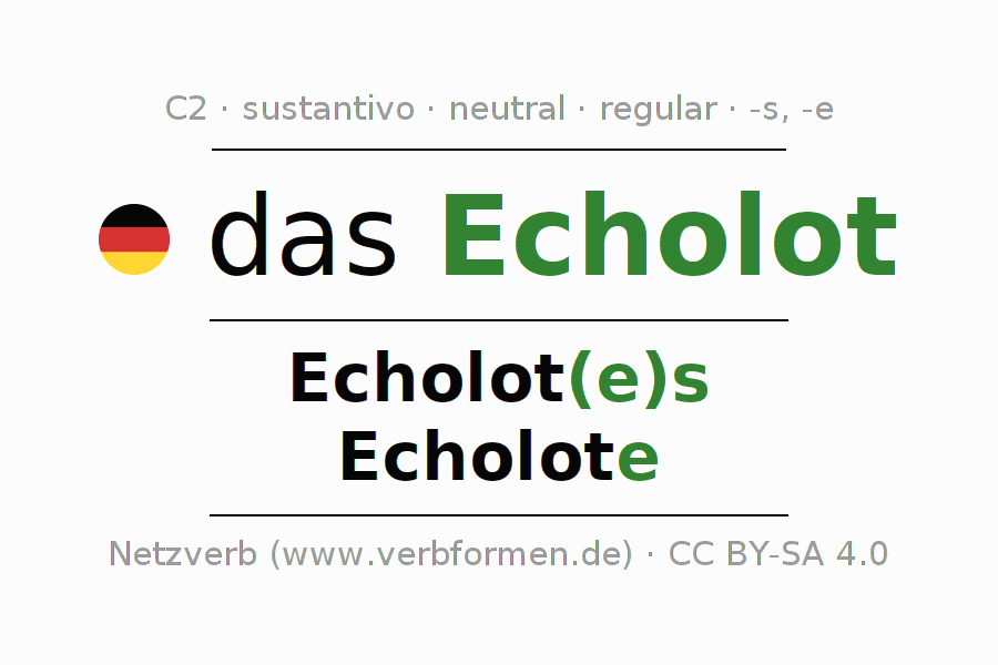 La declinación del sustantivoEcholot (sonar, sonda acústica) se encuentra en genitivoEcholot(e)s del singular y en el nominativoEcholote del plural. El sustantivo Echolot se conjuga de forma fuerte (irregular) con estas terminaciones es/e. El género gramatical de Echolot es neutro y por eso se requiere el artículo definido ‘das’. Aquí puedes declinar no solamente Echolot sino también todos los sustantivos alemanes . Este sustantivo pertenece al vocabulario necesario para pasar el examen "Zertifikat Deutsch" o para el nivel C2. Comentarios ☆