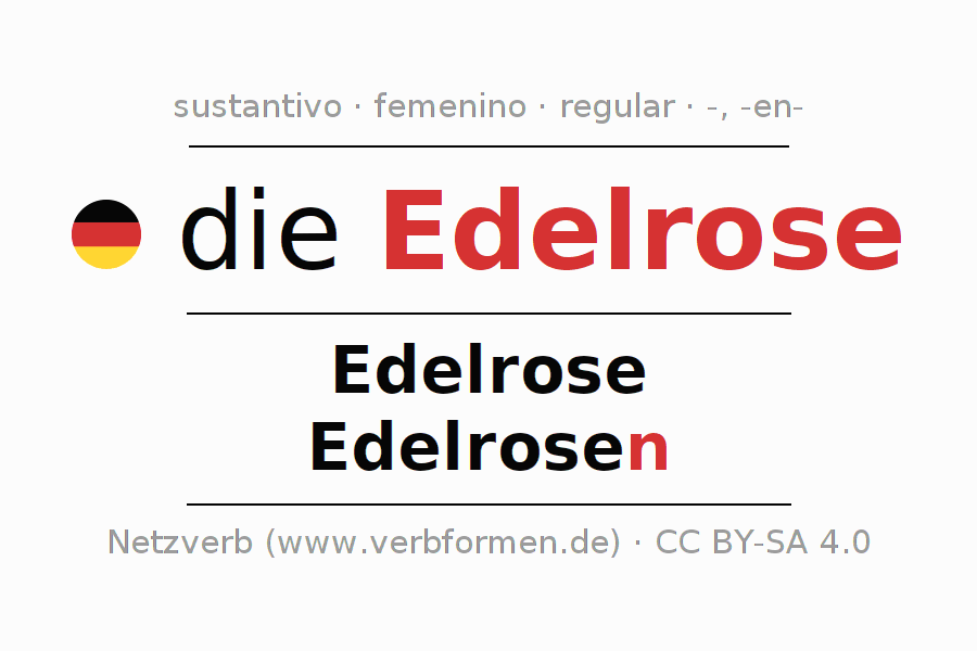 La declinación del sustantivo en forma de tabla con todas su formas: singular, plural y en los cuatro casos: nominativo (primer caso), genitivo (segundo caso), dativo (tercer caso) y acusativo (cuarto caso). Las construcciones gramaticales están representadas de forma clara en una tabla sinópica. La inflexión de los sustantivos es una ayuda durante tareas, exámenes, para cursos de alemán, la universidad, el estudio del alemán como lengua extranjera o como segundo idioma y para estudiantes adultos. La declinación correcta de las palabras es especialmente importante para los que aprenden el idioma alemán. Aquí encontraras más información acerca del tema Wiktionary Edelrose y aquí también a través del Duden Edelrose.