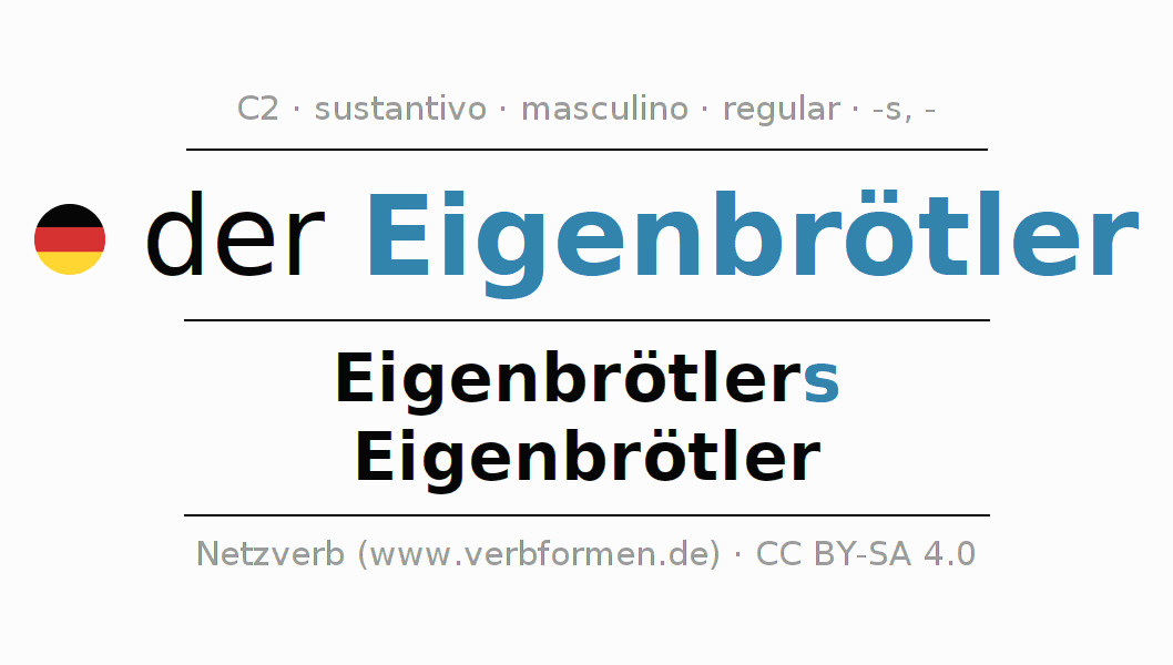 La declinación del sustantivoEigenbrötler (hurón, individuo extraño) se encuentra en genitivoEigenbrötlers del singular y en el nominativoEigenbrötler del plural. El sustantivo Eigenbrötler se conjuga de forma fuerte (irregular) con estas terminaciones s/-. El género gramatical de Eigenbrötler es masculino y por eso se requiere el artículo definido ‘der’. Aquí puedes declinar no solamente Eigenbrötler sino también todos los sustantivos alemanes . Este sustantivo pertenece al vocabulario necesario para pasar el examen "Zertifikat Deutsch" o para el nivel C2. Comentarios ☆