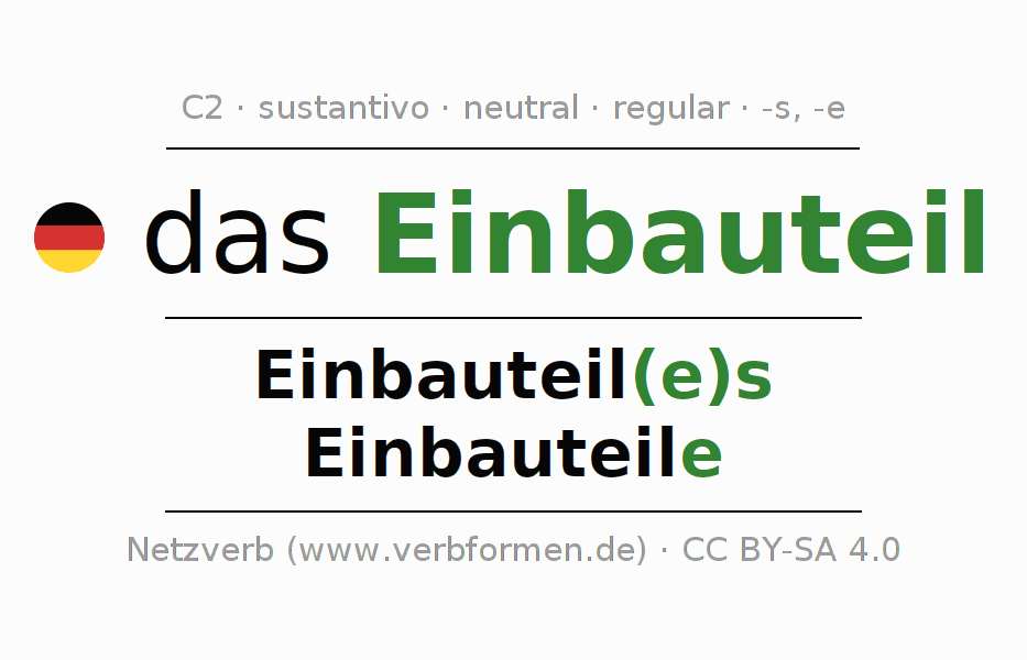 La declinación del sustantivo en forma de tabla con todas su formas: singular, plural y en los cuatro casos: nominativo (primer caso), genitivo (segundo caso), dativo (tercer caso) y acusativo (cuarto caso). Las construcciones gramaticales están representadas de forma clara en una tabla sinópica. La inflexión de los sustantivos es una ayuda durante tareas, exámenes, para cursos de alemán, la universidad, el estudio del alemán como lengua extranjera o como segundo idioma y para estudiantes adultos. La declinación correcta de las palabras es especialmente importante para los que aprenden el idioma alemán. Aquí encontraras más información acerca del tema Wiktionary Einbauteil y aquí también a través del Duden Einbauteil.