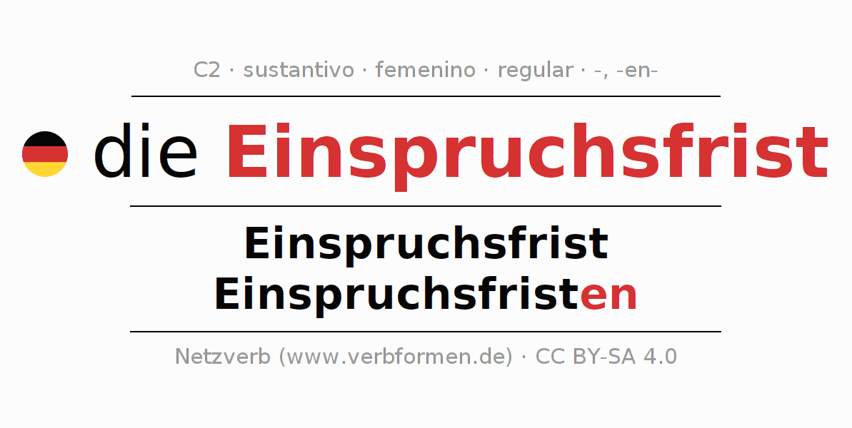 La declinación del sustantivo en forma de tabla con todas su formas: singular, plural y en los cuatro casos: nominativo (primer caso), genitivo (segundo caso), dativo (tercer caso) y acusativo (cuarto caso). Las construcciones gramaticales están representadas de forma clara en una tabla sinópica. La inflexión de los sustantivos es una ayuda durante tareas, exámenes, para cursos de alemán, la universidad, el estudio del alemán como lengua extranjera o como segundo idioma y para estudiantes adultos. La declinación correcta de las palabras es especialmente importante para los que aprenden el idioma alemán. Aquí encontraras más información acerca del tema Wiktionary Einspruchsfrist y aquí también a través del Duden Einspruchsfrist.