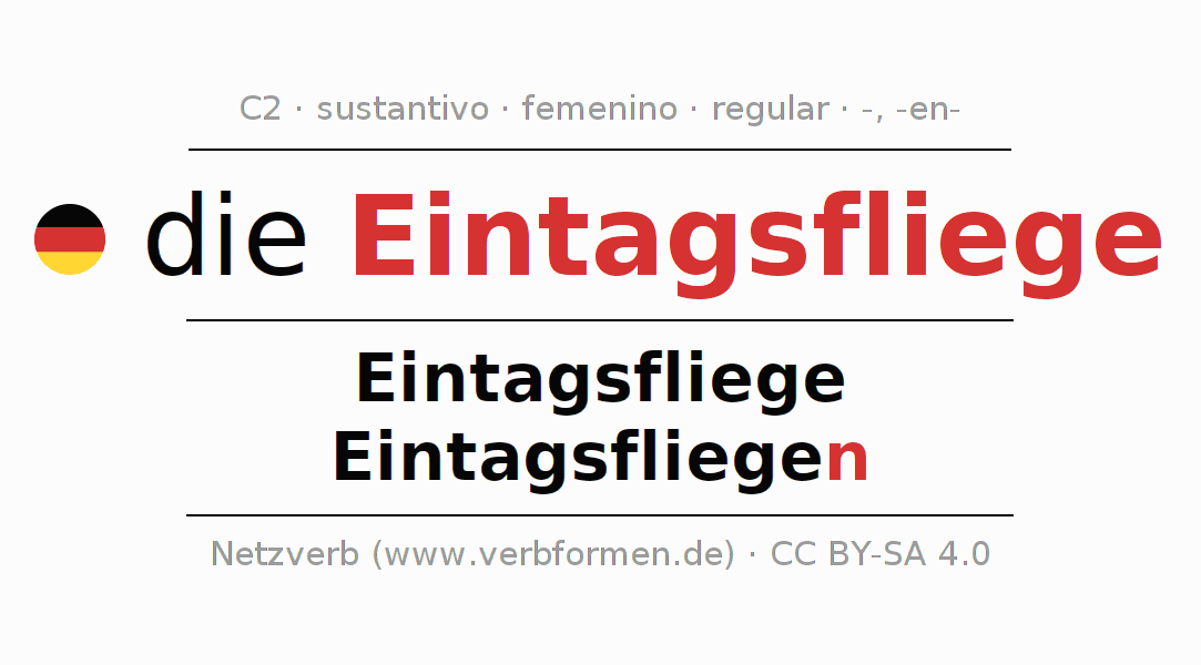 La declinación del sustantivo en forma de tabla con todas su formas: singular, plural y en los cuatro casos: nominativo (primer caso), genitivo (segundo caso), dativo (tercer caso) y acusativo (cuarto caso). Las construcciones gramaticales están representadas de forma clara en una tabla sinópica. La inflexión de los sustantivos es una ayuda durante tareas, exámenes, para cursos de alemán, la universidad, el estudio del alemán como lengua extranjera o como segundo idioma y para estudiantes adultos. La declinación correcta de las palabras es especialmente importante para los que aprenden el idioma alemán. Aquí encontraras más información acerca del tema Wiktionary Eintagsfliege y aquí también a través del Duden Eintagsfliege.
