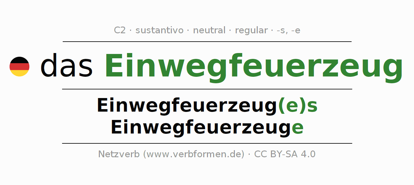 La declinación del sustantivo en forma de tabla con todas su formas: singular, plural y en los cuatro casos: nominativo (primer caso), genitivo (segundo caso), dativo (tercer caso) y acusativo (cuarto caso). Las construcciones gramaticales están representadas de forma clara en una tabla sinópica. La inflexión de los sustantivos es una ayuda durante tareas, exámenes, para cursos de alemán, la universidad, el estudio del alemán como lengua extranjera o como segundo idioma y para estudiantes adultos. La declinación correcta de las palabras es especialmente importante para los que aprenden el idioma alemán. Aquí encontraras más información acerca del tema Wiktionary Einwegfeuerzeug y aquí también a través del Duden Einwegfeuerzeug.