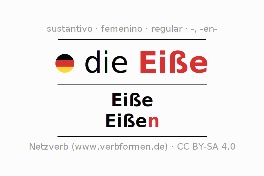 La declinación del sustantivo en forma de tabla con todas su formas: singular, plural y en los cuatro casos: nominativo (primer caso), genitivo (segundo caso), dativo (tercer caso) y acusativo (cuarto caso). Las construcciones gramaticales están representadas de forma clara en una tabla sinópica. La inflexión de los sustantivos es una ayuda durante tareas, exámenes, para cursos de alemán, la universidad, el estudio del alemán como lengua extranjera o como segundo idioma y para estudiantes adultos. La declinación correcta de las palabras es especialmente importante para los que aprenden el idioma alemán. Aquí encontraras más información acerca del tema Wiktionary Eiße y aquí también a través del Duden Eiße.