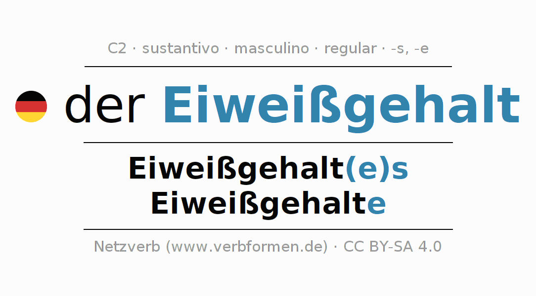 La declinación del sustantivo en forma de tabla con todas su formas: singular, plural y en los cuatro casos: nominativo (primer caso), genitivo (segundo caso), dativo (tercer caso) y acusativo (cuarto caso). Las construcciones gramaticales están representadas de forma clara en una tabla sinópica. La inflexión de los sustantivos es una ayuda durante tareas, exámenes, para cursos de alemán, la universidad, el estudio del alemán como lengua extranjera o como segundo idioma y para estudiantes adultos. La declinación correcta de las palabras es especialmente importante para los que aprenden el idioma alemán. Aquí encontraras más información acerca del tema Wiktionary Eiweißgehalt y aquí también a través del Duden Eiweißgehalt.