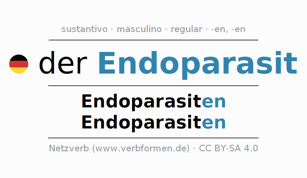 La declinación del sustantivo en forma de tabla con todas su formas: singular, plural y en los cuatro casos: nominativo (primer caso), genitivo (segundo caso), dativo (tercer caso) y acusativo (cuarto caso). Las construcciones gramaticales están representadas de forma clara en una tabla sinópica. La inflexión de los sustantivos es una ayuda durante tareas, exámenes, para cursos de alemán, la universidad, el estudio del alemán como lengua extranjera o como segundo idioma y para estudiantes adultos. La declinación correcta de las palabras es especialmente importante para los que aprenden el idioma alemán. Aquí encontraras más información acerca del tema Wiktionary Endoparasit y aquí también a través del Duden Endoparasit.