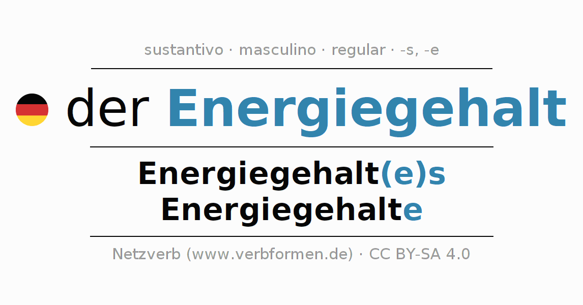 La declinación del sustantivo en forma de tabla con todas su formas: singular, plural y en los cuatro casos: nominativo (primer caso), genitivo (segundo caso), dativo (tercer caso) y acusativo (cuarto caso). Las construcciones gramaticales están representadas de forma clara en una tabla sinópica. La inflexión de los sustantivos es una ayuda durante tareas, exámenes, para cursos de alemán, la universidad, el estudio del alemán como lengua extranjera o como segundo idioma y para estudiantes adultos. La declinación correcta de las palabras es especialmente importante para los que aprenden el idioma alemán. Aquí encontraras más información acerca del tema Wiktionary Energiegehalt y aquí también a través del Duden Energiegehalt.