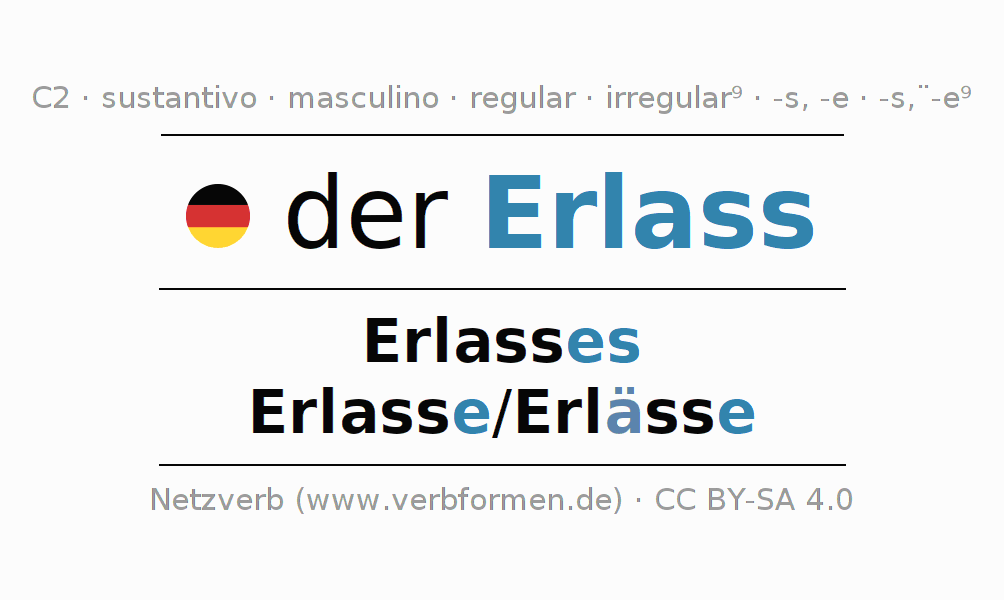La declinación del sustantivoErlass (decreto, condonación) se encuentra en genitivoErlasses del singular y en el nominativoErlasse/Erlässe del plural. El sustantivo Erlass se conjuga de forma fuerte (irregular) con estas terminaciones es/e/ä-e. El plural requiere el uso de diéresis. El género gramatical de Erlass es masculino y por eso se requiere el artículo definido ‘der’. Aquí puedes declinar no solamente Erlass sino también todos los sustantivos alemanes . Este sustantivo pertenece al vocabulario necesario para pasar el examen "Zertifikat Deutsch" o para el nivel C2. Comentarios ☆
