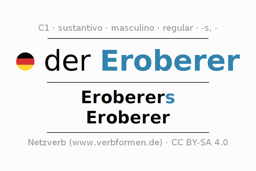 La declinación del sustantivo en forma de tabla con todas su formas: singular, plural y en los cuatro casos: nominativo (primer caso), genitivo (segundo caso), dativo (tercer caso) y acusativo (cuarto caso). Las construcciones gramaticales están representadas de forma clara en una tabla sinópica. La inflexión de los sustantivos es una ayuda durante tareas, exámenes, para cursos de alemán, la universidad, el estudio del alemán como lengua extranjera o como segundo idioma y para estudiantes adultos. La declinación correcta de las palabras es especialmente importante para los que aprenden el idioma alemán. Aquí encontraras más información acerca del tema Wiktionary Eroberer y aquí también a través del Duden Eroberer.