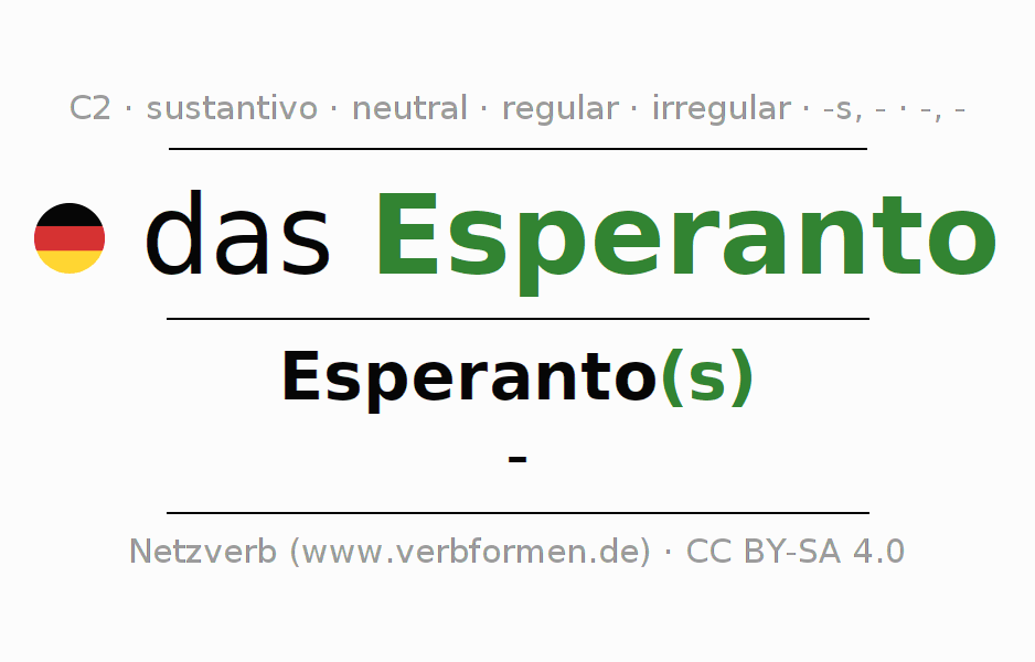 La declinación del sustantivoEsperanto (esperanto, idioma planificado) se encuentra en genitivoEsperanto(s) del singular y en el nominativo- del plural. El sustantivo Esperanto se conjuga de forma fuerte (irregular) con estas terminaciones s/-/-. No permite construcciones en plural. El género gramatical de Esperanto es neutro y por eso se requiere el artículo definido ‘das’. Aquí puedes declinar no solamente Esperanto sino también todos los sustantivos alemanes . Este sustantivo pertenece al vocabulario necesario para pasar el examen "Zertifikat Deutsch" o para el nivel C2. Comentarios ☆