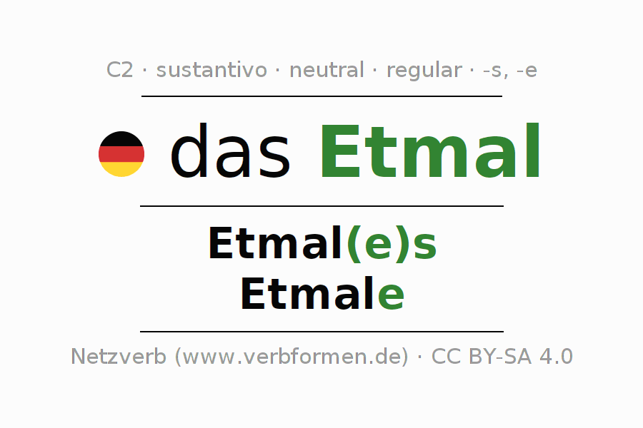 La declinación del sustantivoEtmal (singladura, día solar) se encuentra en genitivoEtmal(e)s del singular y en el nominativoEtmale del plural. El sustantivo Etmal se conjuga de forma fuerte (irregular) con estas terminaciones es/e. El género gramatical de Etmal es neutro y por eso se requiere el artículo definido ‘das’. Aquí puedes declinar no solamente Etmal sino también todos los sustantivos alemanes . Este sustantivo pertenece al vocabulario necesario para pasar el examen "Zertifikat Deutsch" o para el nivel C2. Comentarios ☆