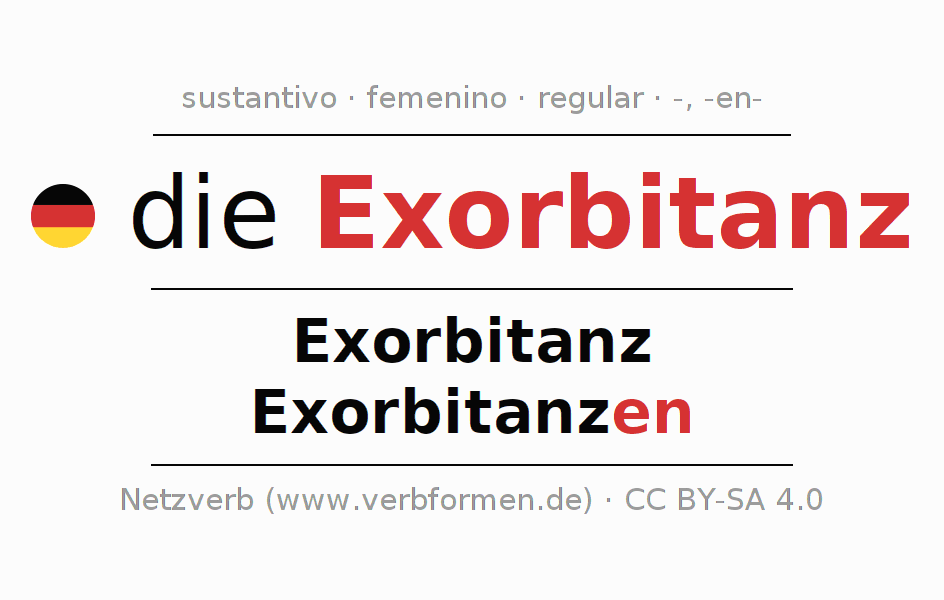La declinación del sustantivo en forma de tabla con todas su formas: singular, plural y en los cuatro casos: nominativo (primer caso), genitivo (segundo caso), dativo (tercer caso) y acusativo (cuarto caso). Las construcciones gramaticales están representadas de forma clara en una tabla sinópica. La inflexión de los sustantivos es una ayuda durante tareas, exámenes, para cursos de alemán, la universidad, el estudio del alemán como lengua extranjera o como segundo idioma y para estudiantes adultos. La declinación correcta de las palabras es especialmente importante para los que aprenden el idioma alemán. Aquí encontraras más información acerca del tema Wiktionary Exorbitanz y aquí también a través del Duden Exorbitanz.