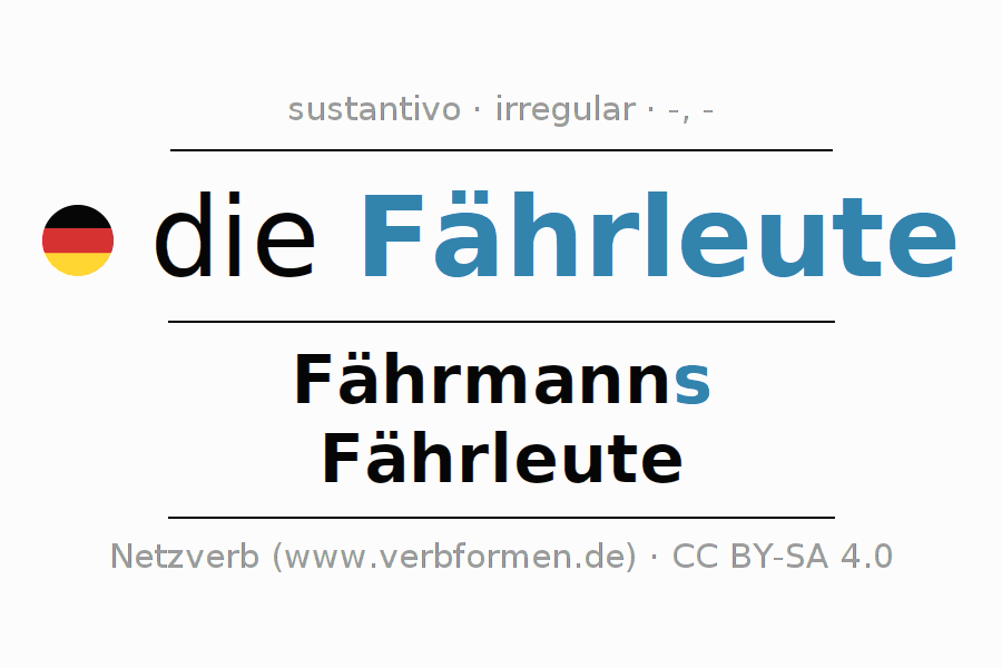 La declinación del sustantivo en forma de tabla con todas su formas: singular, plural y en los cuatro casos: nominativo (primer caso), genitivo (segundo caso), dativo (tercer caso) y acusativo (cuarto caso). Las construcciones gramaticales están representadas de forma clara en una tabla sinópica. La inflexión de los sustantivos es una ayuda durante tareas, exámenes, para cursos de alemán, la universidad, el estudio del alemán como lengua extranjera o como segundo idioma y para estudiantes adultos. La declinación correcta de las palabras es especialmente importante para los que aprenden el idioma alemán. Aquí encontraras más información acerca del tema Wiktionary Fährleute y aquí también a través del Duden Fährleute.