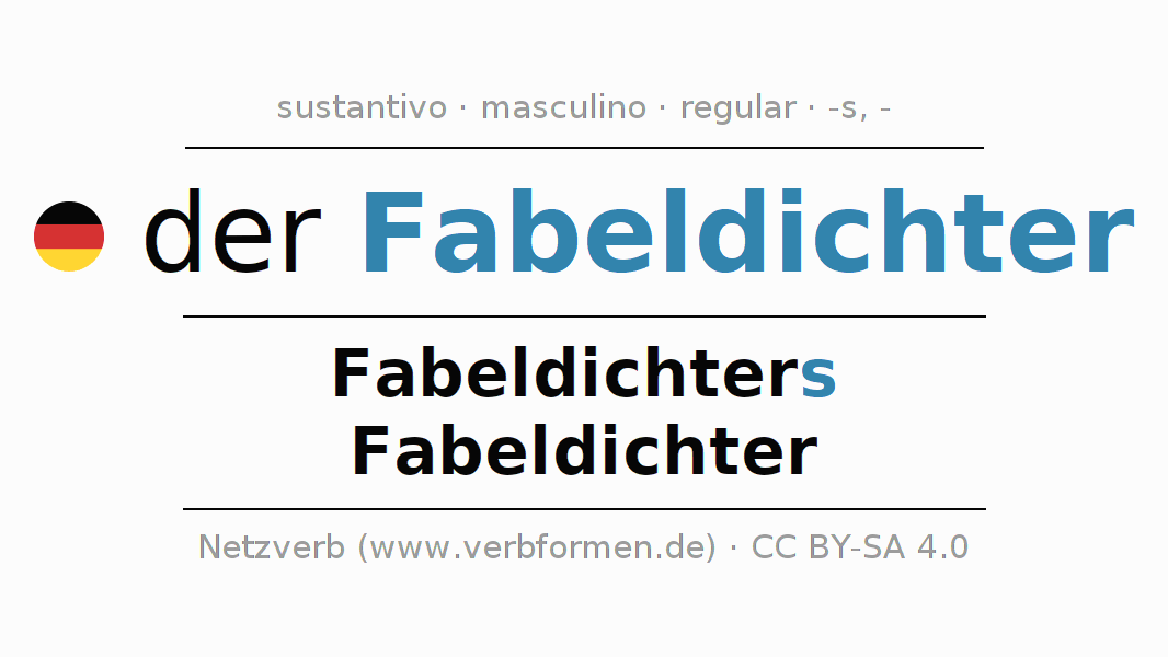 La declinación del sustantivo en forma de tabla con todas su formas: singular, plural y en los cuatro casos: nominativo (primer caso), genitivo (segundo caso), dativo (tercer caso) y acusativo (cuarto caso). Las construcciones gramaticales están representadas de forma clara en una tabla sinópica. La inflexión de los sustantivos es una ayuda durante tareas, exámenes, para cursos de alemán, la universidad, el estudio del alemán como lengua extranjera o como segundo idioma y para estudiantes adultos. La declinación correcta de las palabras es especialmente importante para los que aprenden el idioma alemán. Aquí encontraras más información acerca del tema Wiktionary Fabeldichter y aquí también a través del Duden Fabeldichter.