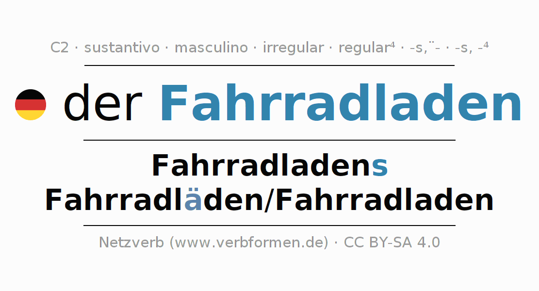 La declinación del sustantivoFahrradladen (tienda de bicicletas) se encuentra en genitivoFahrradladens del singular y en el nominativoFahrradläden/Fahrradladen del plural. El sustantivo Fahrradladen se conjuga de forma fuerte (irregular) con estas terminaciones s/ä-/-. El plural requiere el uso de diéresis. El género gramatical de Fahrradladen es masculino y por eso se requiere el artículo definido ‘der’. Aquí puedes declinar no solamente Fahrradladen sino también todos los sustantivos alemanes . Este sustantivo pertenece al vocabulario necesario para pasar el examen "Zertifikat Deutsch" o para el nivel C2. Comentarios ☆