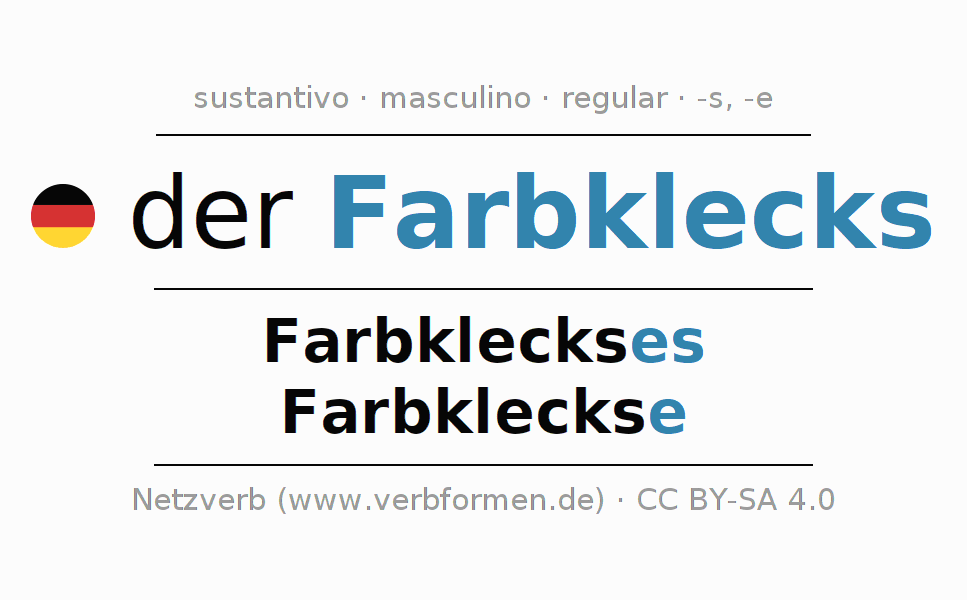 La declinación del sustantivoFarbklecks (mancha de color, pintura) se encuentra en genitivoFarbkleckses del singular y en el nominativoFarbkleckse del plural. El sustantivo Farbklecks se conjuga de forma fuerte (irregular) con estas terminaciones es/e. El género gramatical de Farbklecks es masculino y por eso se requiere el artículo definido ‘der’. Aquí puedes declinar no solamente Farbklecks sino también todos los sustantivos alemanes . Comentarios ☆