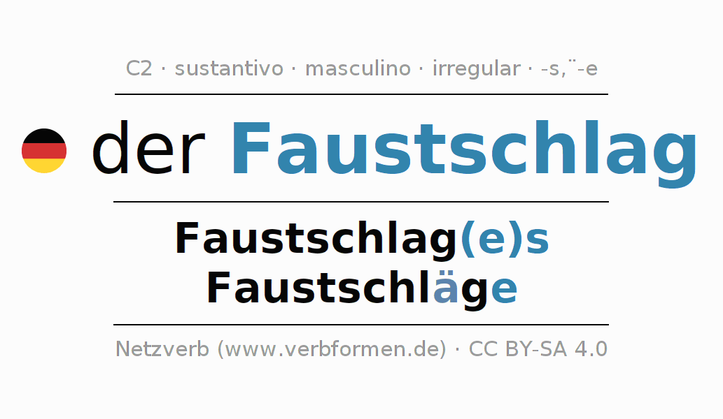La declinación del sustantivo en forma de tabla con todas su formas: singular, plural y en los cuatro casos: nominativo (primer caso), genitivo (segundo caso), dativo (tercer caso) y acusativo (cuarto caso). Las construcciones gramaticales están representadas de forma clara en una tabla sinópica. La inflexión de los sustantivos es una ayuda durante tareas, exámenes, para cursos de alemán, la universidad, el estudio del alemán como lengua extranjera o como segundo idioma y para estudiantes adultos. La declinación correcta de las palabras es especialmente importante para los que aprenden el idioma alemán. Aquí encontraras más información acerca del tema Wiktionary Faustschlag y aquí también a través del Duden Faustschlag.