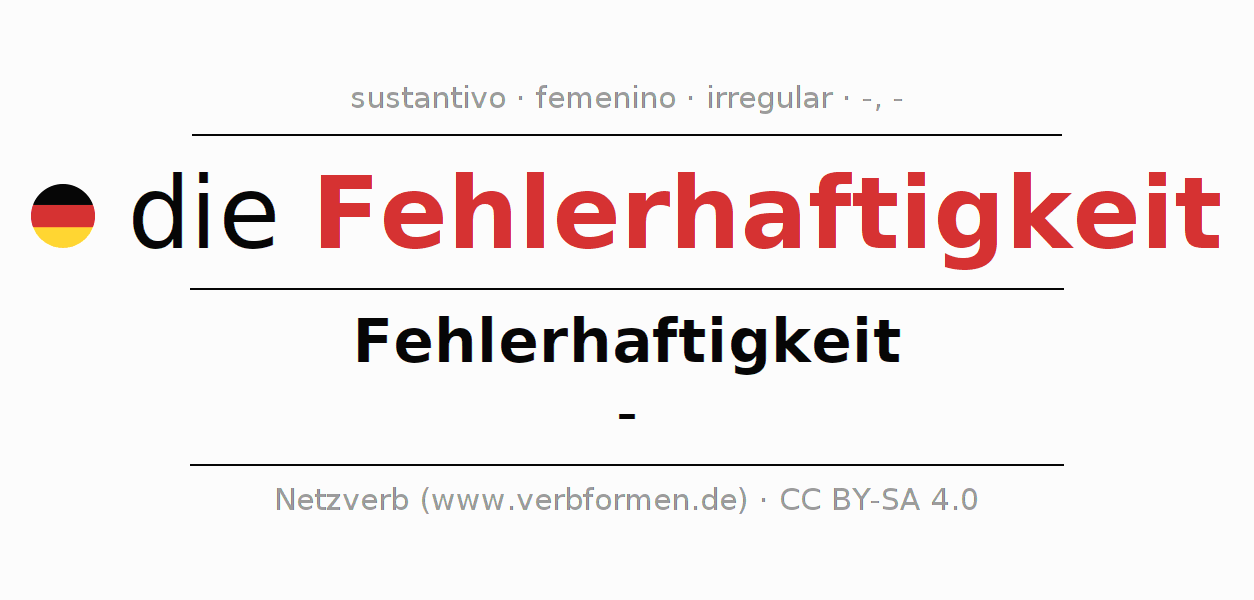 La declinación del sustantivoFehlerhaftigkeit (defectuosidad, deficiencia) se encuentra en genitivoFehlerhaftigkeit del singular y en el nominativo- del plural. El sustantivo Fehlerhaftigkeit se declina con las terminaciones -/-. No permite construcciones en plural. El género gramatical de Fehlerhaftigkeit es femenino y por eso se requiere el artículo definido ‘die’. Aquí puedes declinar no solamente Fehlerhaftigkeit sino también todos los sustantivos alemanes . Comentarios ☆