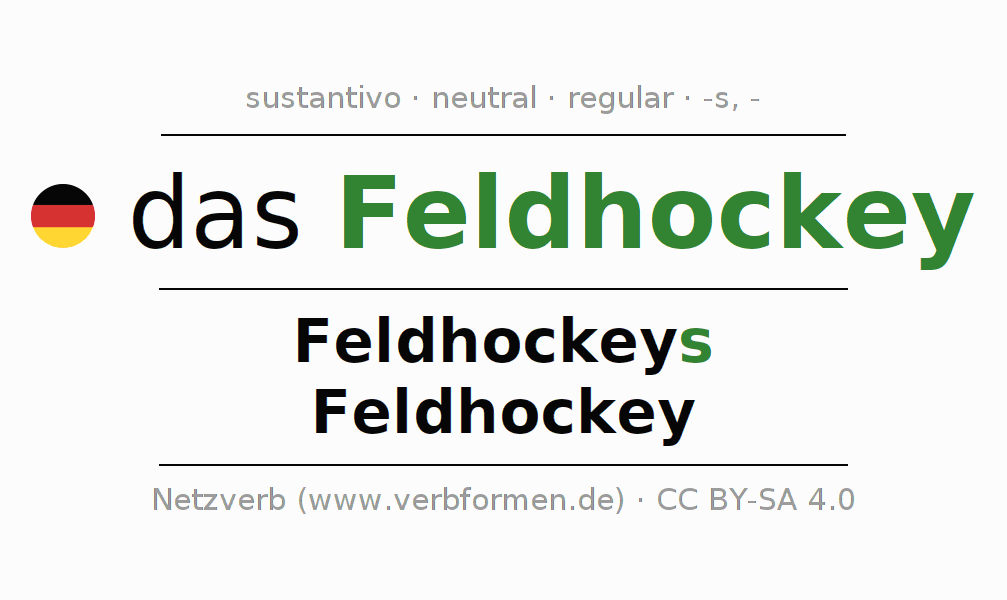 La declinación del sustantivoFeldhockey (hockey sobre césped, hockey sobre hierba) se encuentra en genitivoFeldhockeys del singular y en el nominativoFeldhockey del plural. El sustantivo Feldhockey se conjuga de forma fuerte (irregular) con estas terminaciones s/-. El género gramatical de Feldhockey es neutro y por eso se requiere el artículo definido ‘das’. Aquí puedes declinar no solamente Feldhockey sino también todos los sustantivos alemanes . Comentarios ☆