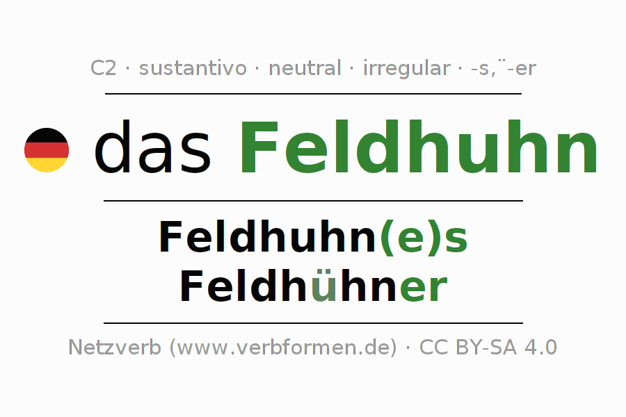 La declinación del sustantivoFeldhuhn (perdiz) se encuentra en genitivoFeldhuhn(e)s del singular y en el nominativoFeldhühner del plural. El sustantivo Feldhuhn se conjuga de forma fuerte (irregular) con estas terminaciones es/ü-er. El plural requiere el uso de diéresis. El género gramatical de Feldhuhn es neutro y por eso se requiere el artículo definido ‘das’. Aquí puedes declinar no solamente Feldhuhn sino también todos los sustantivos alemanes . Este sustantivo pertenece al vocabulario necesario para pasar el examen "Zertifikat Deutsch" o para el nivel C2. Comentarios ☆
