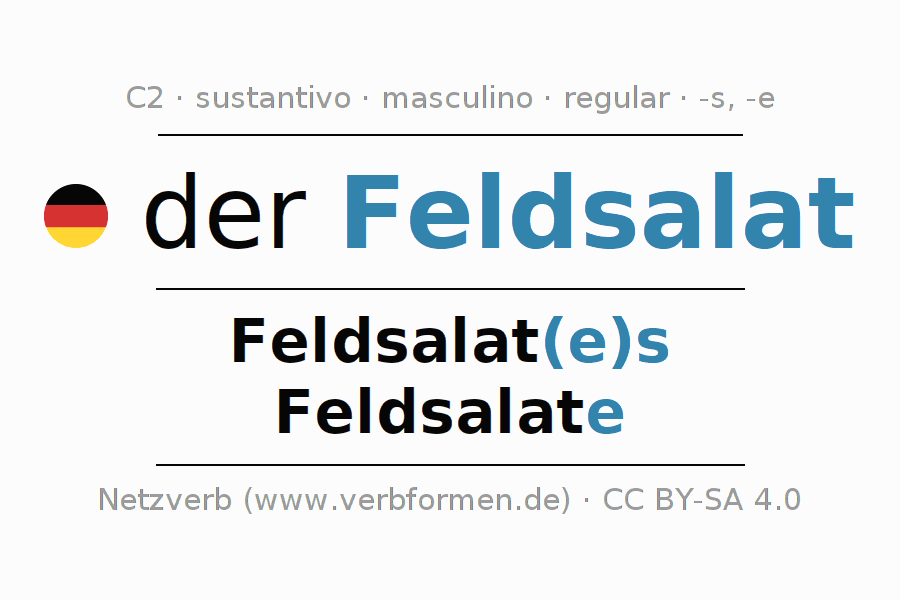 La declinación del sustantivo en forma de tabla con todas su formas: singular, plural y en los cuatro casos: nominativo (primer caso), genitivo (segundo caso), dativo (tercer caso) y acusativo (cuarto caso). Las construcciones gramaticales están representadas de forma clara en una tabla sinópica. La inflexión de los sustantivos es una ayuda durante tareas, exámenes, para cursos de alemán, la universidad, el estudio del alemán como lengua extranjera o como segundo idioma y para estudiantes adultos. La declinación correcta de las palabras es especialmente importante para los que aprenden el idioma alemán. Aquí encontraras más información acerca del tema Wiktionary Feldsalat y aquí también a través del Duden Feldsalat.