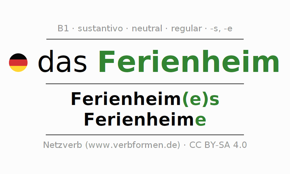 La declinación del sustantivoFerienheim (alojamiento vacacional, casa de vacaciones) se encuentra en genitivoFerienheim(e)s del singular y en el nominativoFerienheime del plural. El sustantivo Ferienheim se conjuga de forma fuerte (irregular) con estas terminaciones es/e. El género gramatical de Ferienheim es neutro y por eso se requiere el artículo definido ‘das’. Aquí puedes declinar no solamente Ferienheim sino también todos los sustantivos alemanes . Este sustantivo pertenece al vocabulario necesario para pasar el examen "Zertifikat Deutsch" o para el nivel B1. Comentarios ☆