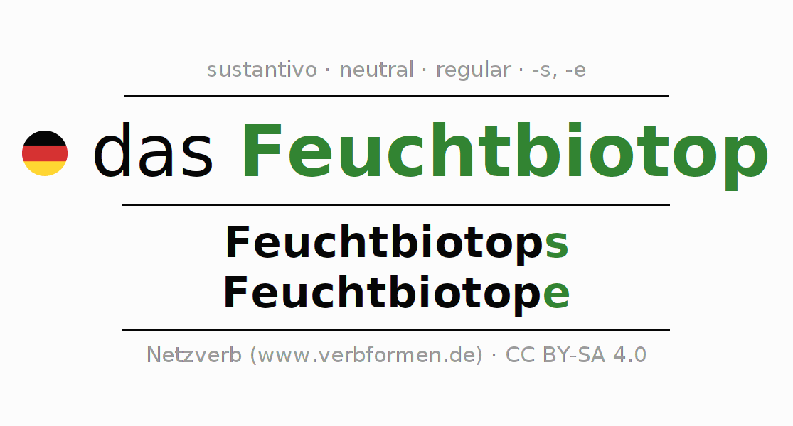 La declinación del sustantivo en forma de tabla con todas su formas: singular, plural y en los cuatro casos: nominativo (primer caso), genitivo (segundo caso), dativo (tercer caso) y acusativo (cuarto caso). Las construcciones gramaticales están representadas de forma clara en una tabla sinópica. La inflexión de los sustantivos es una ayuda durante tareas, exámenes, para cursos de alemán, la universidad, el estudio del alemán como lengua extranjera o como segundo idioma y para estudiantes adultos. La declinación correcta de las palabras es especialmente importante para los que aprenden el idioma alemán. Aquí encontraras más información acerca del tema Wiktionary Feuchtbiotop y aquí también a través del Duden Feuchtbiotop.