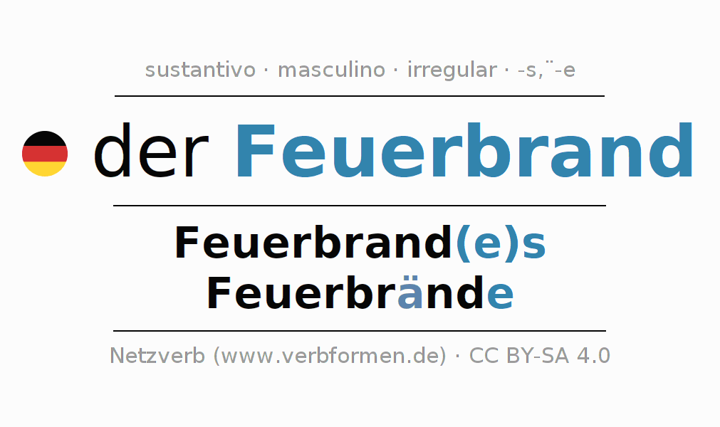 La declinación del sustantivo en forma de tabla con todas su formas: singular, plural y en los cuatro casos: nominativo (primer caso), genitivo (segundo caso), dativo (tercer caso) y acusativo (cuarto caso). Las construcciones gramaticales están representadas de forma clara en una tabla sinópica. La inflexión de los sustantivos es una ayuda durante tareas, exámenes, para cursos de alemán, la universidad, el estudio del alemán como lengua extranjera o como segundo idioma y para estudiantes adultos. La declinación correcta de las palabras es especialmente importante para los que aprenden el idioma alemán. Aquí encontraras más información acerca del tema Wiktionary Feuerbrand y aquí también a través del Duden Feuerbrand.