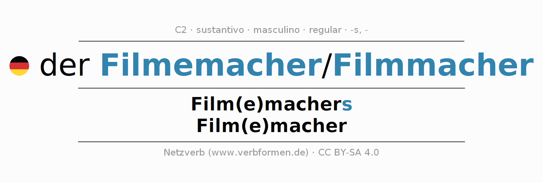 La declinación del sustantivo en forma de tabla con todas su formas: singular, plural y en los cuatro casos: nominativo (primer caso), genitivo (segundo caso), dativo (tercer caso) y acusativo (cuarto caso). Las construcciones gramaticales están representadas de forma clara en una tabla sinópica. La inflexión de los sustantivos es una ayuda durante tareas, exámenes, para cursos de alemán, la universidad, el estudio del alemán como lengua extranjera o como segundo idioma y para estudiantes adultos. La declinación correcta de las palabras es especialmente importante para los que aprenden el idioma alemán. Aquí encontraras más información acerca del tema Wiktionary Filmemacher y aquí también a través del Duden Filmemacher.