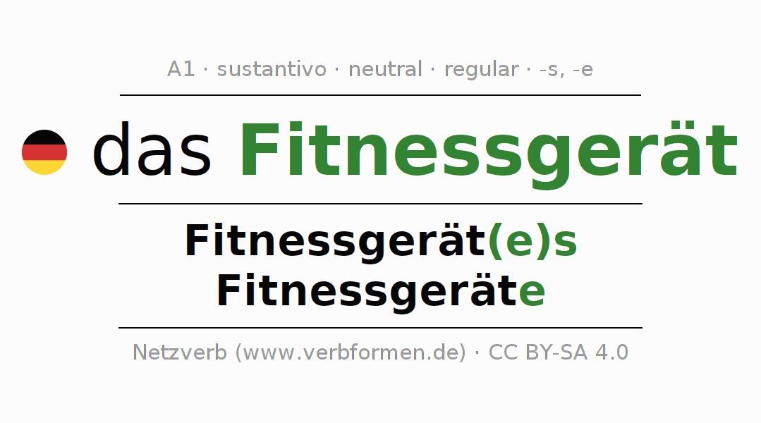 La declinación del sustantivo en forma de tabla con todas su formas: singular, plural y en los cuatro casos: nominativo (primer caso), genitivo (segundo caso), dativo (tercer caso) y acusativo (cuarto caso). Las construcciones gramaticales están representadas de forma clara en una tabla sinópica. La inflexión de los sustantivos es una ayuda durante tareas, exámenes, para cursos de alemán, la universidad, el estudio del alemán como lengua extranjera o como segundo idioma y para estudiantes adultos. La declinación correcta de las palabras es especialmente importante para los que aprenden el idioma alemán. Aquí encontraras más información acerca del tema Wiktionary Fitnessgerät y aquí también a través del Duden Fitnessgerät.