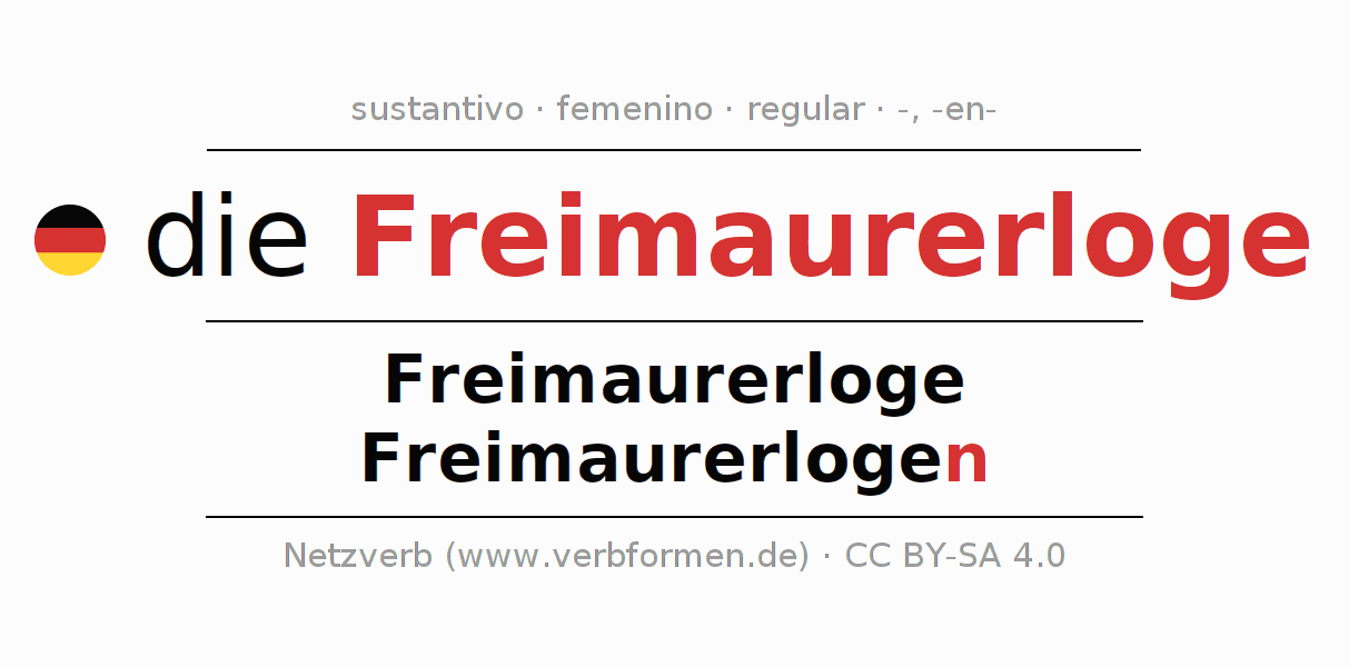 La declinación del sustantivoFreimaurerloge (logia masónica) se encuentra en genitivoFreimaurerloge del singular y en el nominativoFreimaurerlogen del plural. El sustantivo Freimaurerloge se declina de forma débil con las terminaciones -/n. El género gramatical de Freimaurerloge es femenino y por eso se requiere el artículo definido ‘die’. Aquí puedes declinar no solamente Freimaurerloge sino también todos los sustantivos alemanes . Comentarios ☆