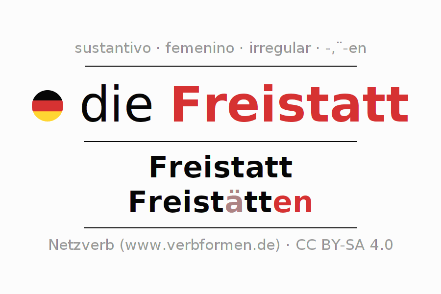 La declinación del sustantivoFreistatt (asilo, refugio) se encuentra en genitivoFreistatt del singular y en el nominativoFreistätten del plural. El sustantivo Freistatt se conjuga de forma fuerte (irregular) con estas terminaciones -/ä-en. El plural requiere el uso de diéresis. El género gramatical de Freistatt es femenino y por eso se requiere el artículo definido ‘die’. Aquí puedes declinar no solamente Freistatt sino también todos los sustantivos alemanes . Comentarios ☆