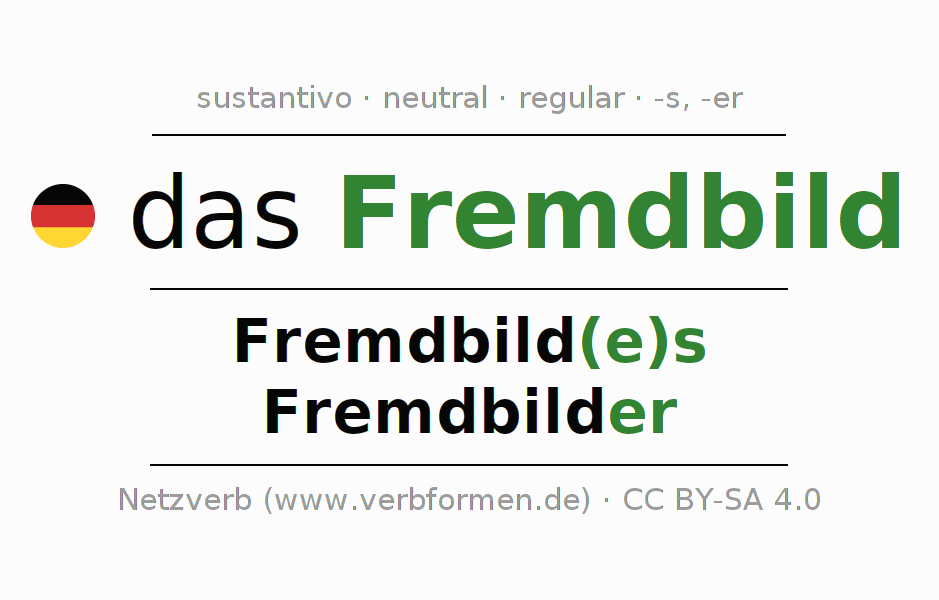 La declinación del sustantivo en forma de tabla con todas su formas: singular, plural y en los cuatro casos: nominativo (primer caso), genitivo (segundo caso), dativo (tercer caso) y acusativo (cuarto caso). Las construcciones gramaticales están representadas de forma clara en una tabla sinópica. La inflexión de los sustantivos es una ayuda durante tareas, exámenes, para cursos de alemán, la universidad, el estudio del alemán como lengua extranjera o como segundo idioma y para estudiantes adultos. La declinación correcta de las palabras es especialmente importante para los que aprenden el idioma alemán. Aquí encontraras más información acerca del tema Wiktionary Fremdbild y aquí también a través del Duden Fremdbild.