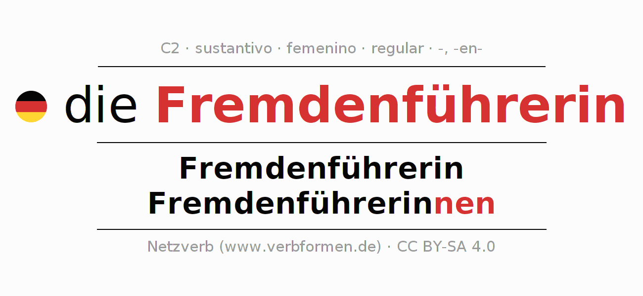 La declinación del sustantivoFremdenführerin (guía, guía turística) se encuentra en genitivoFremdenführerin del singular y en el nominativoFremdenführerinnen del plural. El sustantivo Fremdenführerin se declina de forma débil con las terminaciones -/nen. El género gramatical de Fremdenführerin es femenino y por eso se requiere el artículo definido ‘die’. Aquí puedes declinar no solamente Fremdenführerin sino también todos los sustantivos alemanes . Este sustantivo pertenece al vocabulario necesario para pasar el examen "Zertifikat Deutsch" o para el nivel C2. Comentarios ☆