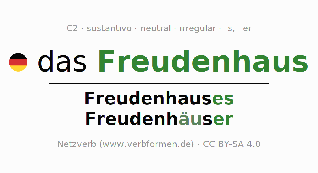La declinación del sustantivo en forma de tabla con todas su formas: singular, plural y en los cuatro casos: nominativo (primer caso), genitivo (segundo caso), dativo (tercer caso) y acusativo (cuarto caso). Las construcciones gramaticales están representadas de forma clara en una tabla sinópica. La inflexión de los sustantivos es una ayuda durante tareas, exámenes, para cursos de alemán, la universidad, el estudio del alemán como lengua extranjera o como segundo idioma y para estudiantes adultos. La declinación correcta de las palabras es especialmente importante para los que aprenden el idioma alemán. Aquí encontraras más información acerca del tema Wiktionary Freudenhaus y aquí también a través del Duden Freudenhaus.