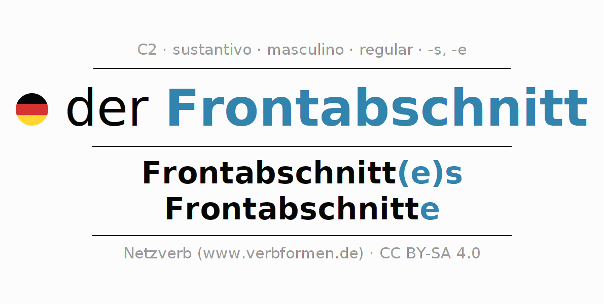 La declinación del sustantivo en forma de tabla con todas su formas: singular, plural y en los cuatro casos: nominativo (primer caso), genitivo (segundo caso), dativo (tercer caso) y acusativo (cuarto caso). Las construcciones gramaticales están representadas de forma clara en una tabla sinópica. La inflexión de los sustantivos es una ayuda durante tareas, exámenes, para cursos de alemán, la universidad, el estudio del alemán como lengua extranjera o como segundo idioma y para estudiantes adultos. La declinación correcta de las palabras es especialmente importante para los que aprenden el idioma alemán. Aquí encontraras más información acerca del tema Wiktionary Frontabschnitt y aquí también a través del Duden Frontabschnitt.