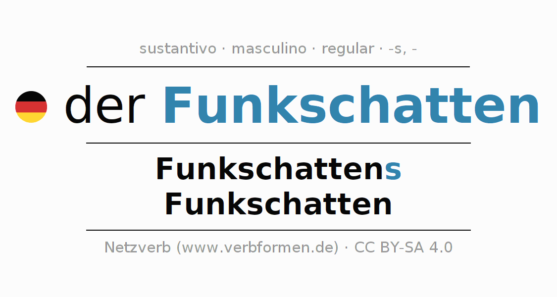 La declinación del sustantivoFunkschatten (zona muerta, área sin señal) se encuentra en genitivoFunkschattens del singular y en el nominativoFunkschatten del plural. El sustantivo Funkschatten se conjuga de forma fuerte (irregular) con estas terminaciones s/-. El género gramatical de Funkschatten es masculino y por eso se requiere el artículo definido ‘der’. Aquí puedes declinar no solamente Funkschatten sino también todos los sustantivos alemanes . Comentarios ☆