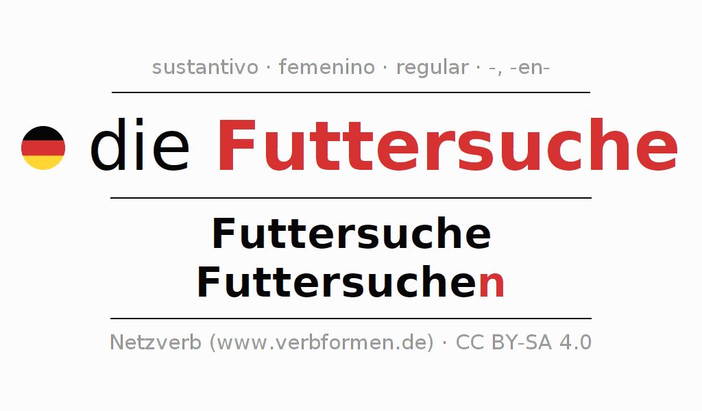 La declinación del sustantivoFuttersuche (búsqueda de alimento, búsqueda de comida) se encuentra en genitivoFuttersuche del singular y en el nominativoFuttersuchen del plural. El sustantivo Futtersuche se declina de forma débil con las terminaciones -/n. El género gramatical de Futtersuche es femenino y por eso se requiere el artículo definido ‘die’. Aquí puedes declinar no solamente Futtersuche sino también todos los sustantivos alemanes . Comentarios ☆