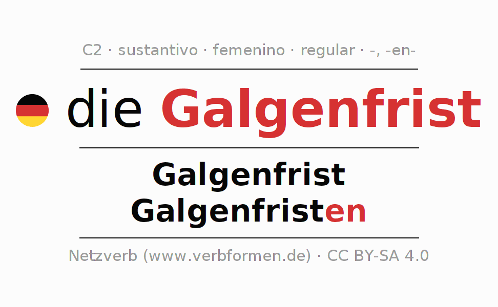 La declinación del sustantivo en forma de tabla con todas su formas: singular, plural y en los cuatro casos: nominativo (primer caso), genitivo (segundo caso), dativo (tercer caso) y acusativo (cuarto caso). Las construcciones gramaticales están representadas de forma clara en una tabla sinópica. La inflexión de los sustantivos es una ayuda durante tareas, exámenes, para cursos de alemán, la universidad, el estudio del alemán como lengua extranjera o como segundo idioma y para estudiantes adultos. La declinación correcta de las palabras es especialmente importante para los que aprenden el idioma alemán. Aquí encontraras más información acerca del tema Wiktionary Galgenfrist y aquí también a través del Duden Galgenfrist.