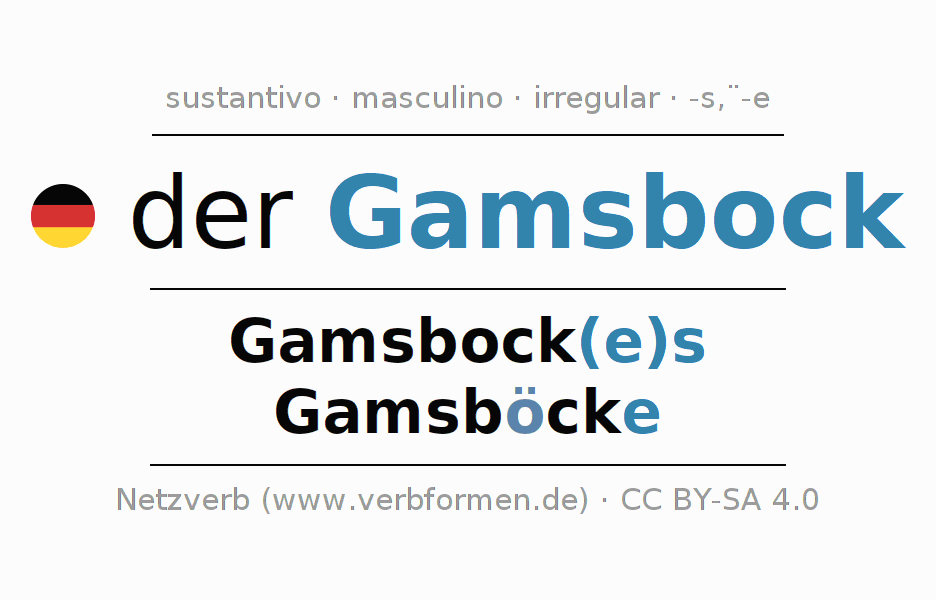 La declinación del sustantivo en forma de tabla con todas su formas: singular, plural y en los cuatro casos: nominativo (primer caso), genitivo (segundo caso), dativo (tercer caso) y acusativo (cuarto caso). Las construcciones gramaticales están representadas de forma clara en una tabla sinópica. La inflexión de los sustantivos es una ayuda durante tareas, exámenes, para cursos de alemán, la universidad, el estudio del alemán como lengua extranjera o como segundo idioma y para estudiantes adultos. La declinación correcta de las palabras es especialmente importante para los que aprenden el idioma alemán. Aquí encontraras más información acerca del tema Wiktionary Gamsbock y aquí también a través del Duden Gamsbock.