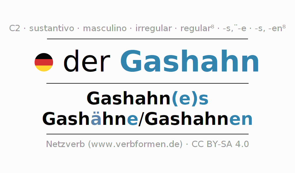 La declinación del sustantivo en forma de tabla con todas su formas: singular, plural y en los cuatro casos: nominativo (primer caso), genitivo (segundo caso), dativo (tercer caso) y acusativo (cuarto caso). Las construcciones gramaticales están representadas de forma clara en una tabla sinópica. La inflexión de los sustantivos es una ayuda durante tareas, exámenes, para cursos de alemán, la universidad, el estudio del alemán como lengua extranjera o como segundo idioma y para estudiantes adultos. La declinación correcta de las palabras es especialmente importante para los que aprenden el idioma alemán. Aquí encontraras más información acerca del tema Wiktionary Gashahn y aquí también a través del Duden Gashahn.